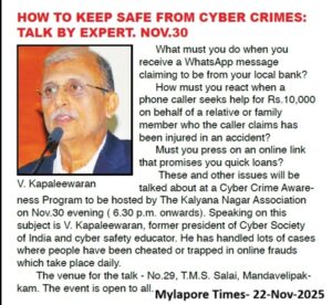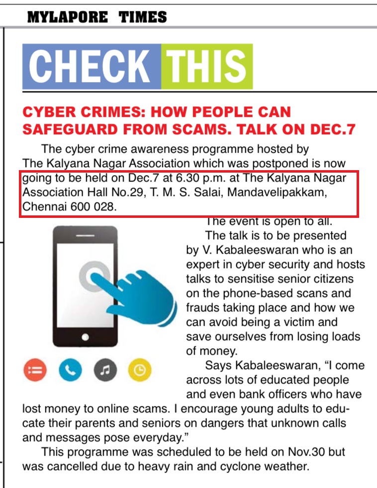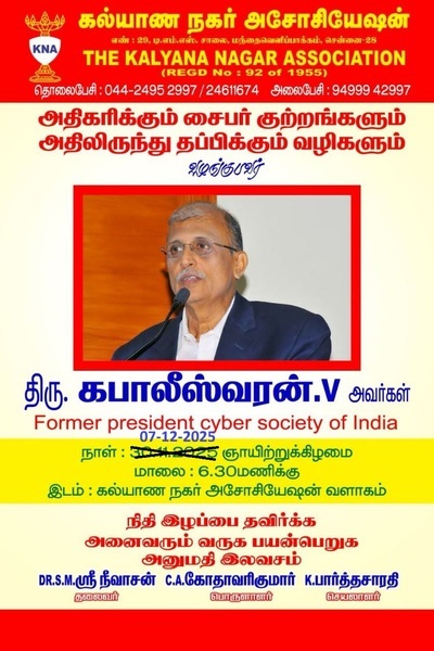 Kalyana Nagar Association , KNA , a popular a Socio-Cultural institution situated in Mandavelipakkam, Chennai, India, has been involved in rendering various services to the neighborhood society for nearly six decades. As part of its periodical community awareness initiative KNA organized a session titled ‘Increasing Cyber Crimes and Preventive measures ’ , to commemorate the Computer Security Day being observed globally on the 30th of November every year.