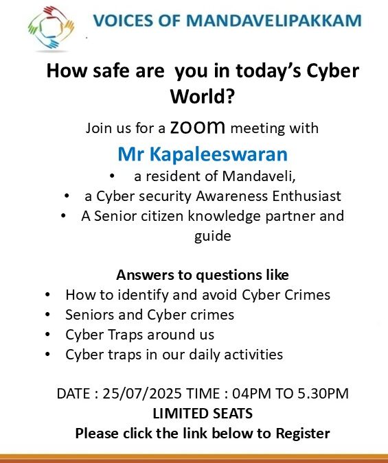 Voices of Mandavelipakkam, is a group involved with efforts to have meaningful dialog on common issues in Mandavelipakkam, an area in Chennai, India. The group invited me to address the members and other residents on a topic that could sensitize general public to the prevailing cyber security threats and how one could safeguard themselves against them.